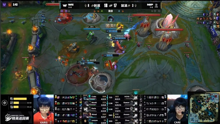 后期WE拿到大龙,双方经济持平。随后WE利用大龙buff推掉NIP种下高地塔,经济反超3k。