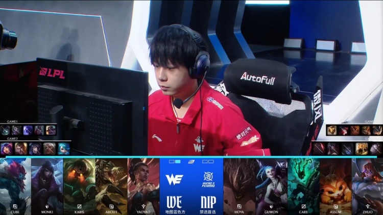 第二局前期yaoyao泰坦连死两次,小龙团About厄斐琉斯遭Monki石头人拍脸,后者拿到双杀,NIP打出0换3经济领先2k。紧接着yaoyao泰坦钩Assum金克丝帮助About拿到终结,Monki大人头送给Karis梅尔,WE扳平前期劣势。