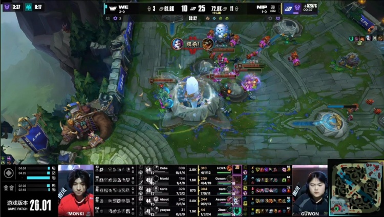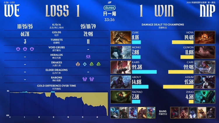 中期先锋团Care阿萝拉双杀,NIP打出1换4。Karis梅尔带队稳住局势,野区团战双方打出2换2,NIP强势开大龙,Assum金克丝强势启动双杀,NIP回头拿到炼金龙魂,经济领先6k。