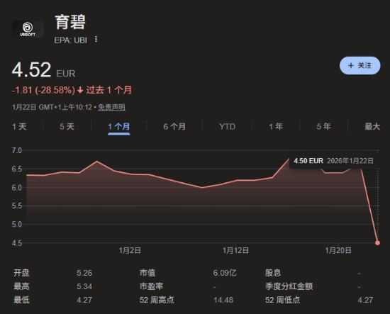 而今日,育碧公司的股价暴跌约30%,单股从之前的6欧元(上下浮动)掉到了4.5欧元左右,创下了公司发展多年以来的历史最低价。