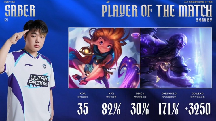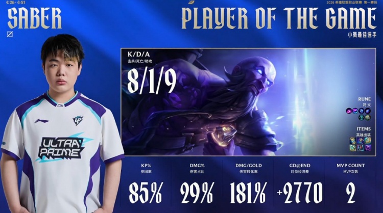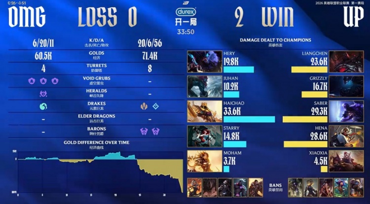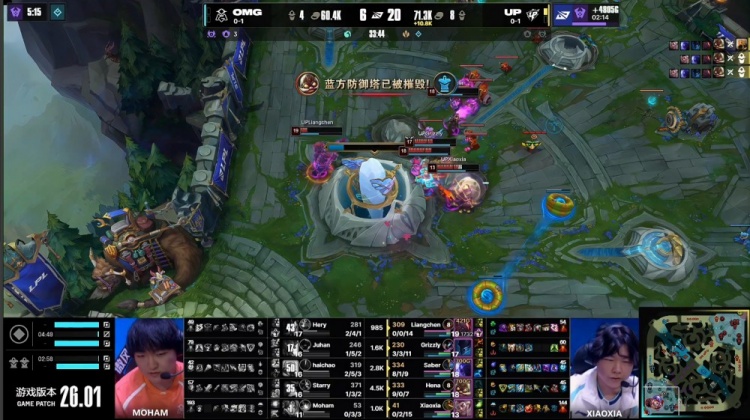 后期UP中路推进,OMG正面溃败被UP打出2换4,UP再拿大龙一波推平OMG基地拿到比赛胜利。
