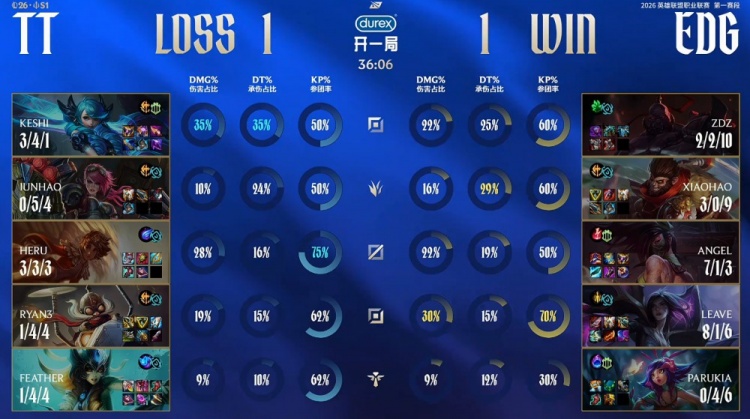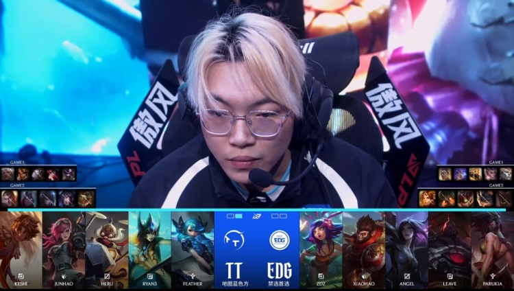 后期Angel阿卡丽上路被抓,EDG趁机推掉TT中路二塔。随后上路团战,Angel阿卡丽轻松拿到双杀,EDG打出1换5团灭TT,EDG拿到二代大龙,Keshi格温复活来大龙坑再送人头,EDG经济领先1w以上。最终EDG拿到三代大龙,Leave卡莎进场切掉Ryan3飞机,Angel再拿双杀,EDG打出1换4,一波推平TT基地扳回一城。