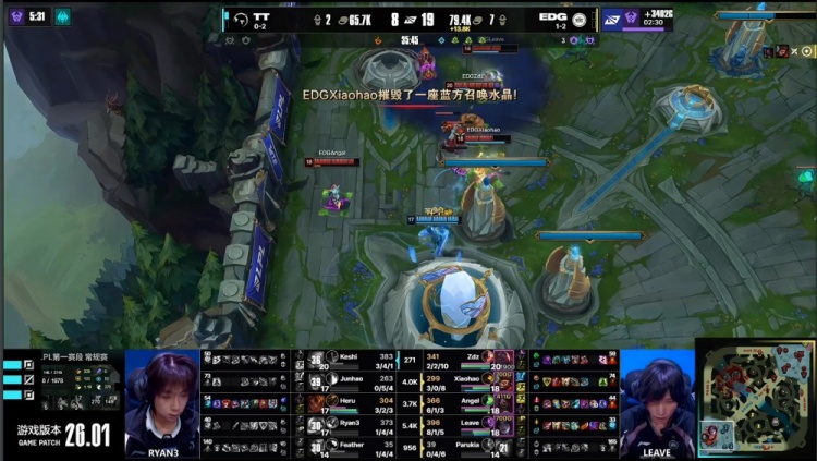 第二局前期Parukia妮蔻大招开两人,xiaohao猴子跟上拿到Ryan3飞机一血。随后河道混战Angel阿卡丽进场逮捕Junhao蔚,Heru岩雀下路被越,EDG打出1换3,经济领先3k。