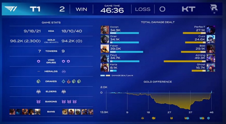 直播吧01月23日讯 T1 2:0 KT,赛后数据面板显示T1在落后13.9k经济差的情况下最终翻盘比赛。