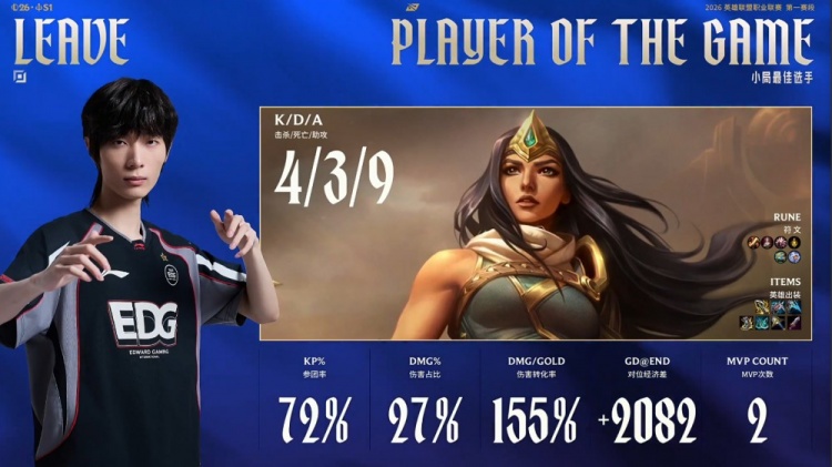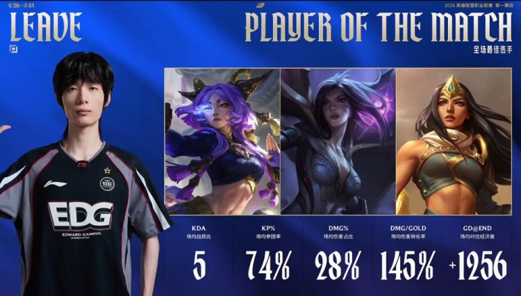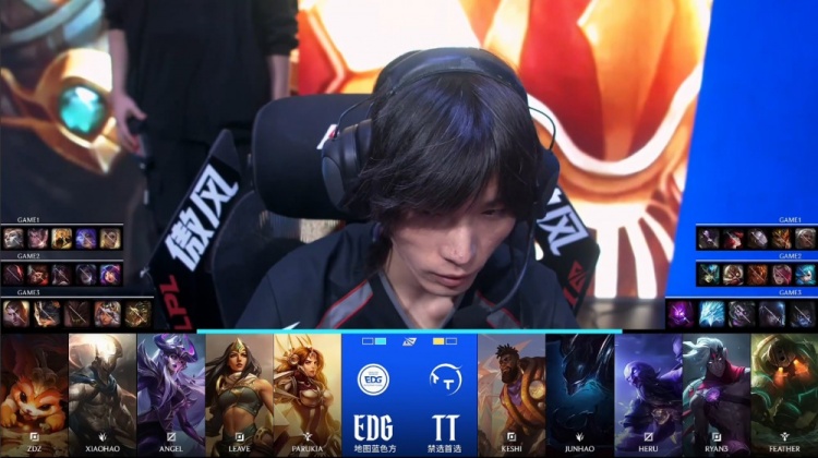 第三局前期Xiaohao潘森河道强杀Angel辛德拉一血,随后EDG多人两度中路包夹Heru瑞兹得手。后续Heru瑞兹开车吃掉两个人头,Keshi奎桑提上路单杀换线的Leave希维尔。双方经济持平。