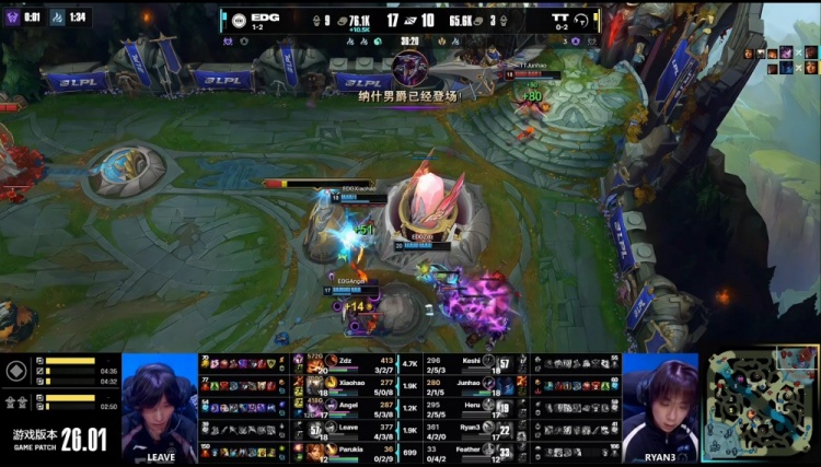 中期小龙团,Keshi奎桑提游龙力保Ryan3韦鲁斯双杀,TT打出0换3,双方依旧难解难分。大龙团EDG打出1换4,但TT复活后搏命吃大龙得手,但EDG依旧打出0换2,经济领先6k。