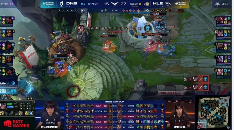 第一局前期河道混战双方打野率先互换,DNS双C拿头,小吕布落单被卖,DNS打出1换2。巢虫团Peter牛头击飞HLE野辅,DuDu雷克塞跟上轻松双杀。上路三角草再战,Zeka沙皇死前推三人,小吕布韦鲁斯大招控三人,HLE打出1换3扳平前期劣势。