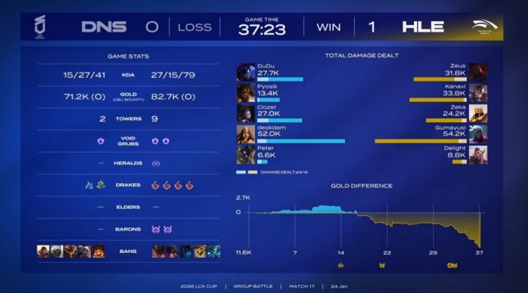 中期小龙团DNS野辅被杀,HLE放出先锋撞掉DNS中路一塔。此后HLE连战连捷,大龙团打出0换2后,HLE拿到大龙,经济领先4k。后续小龙团小吕布与宙斯战至最后,HLE打出3换4稳住局面。