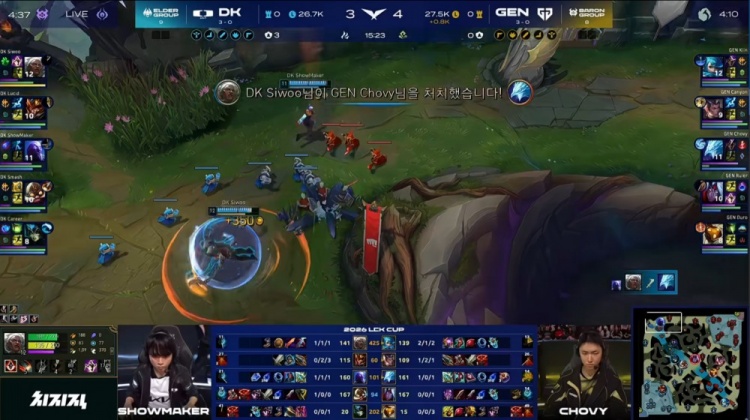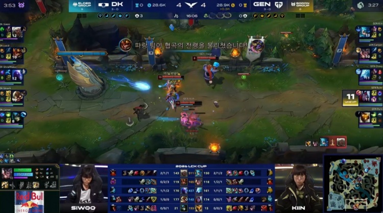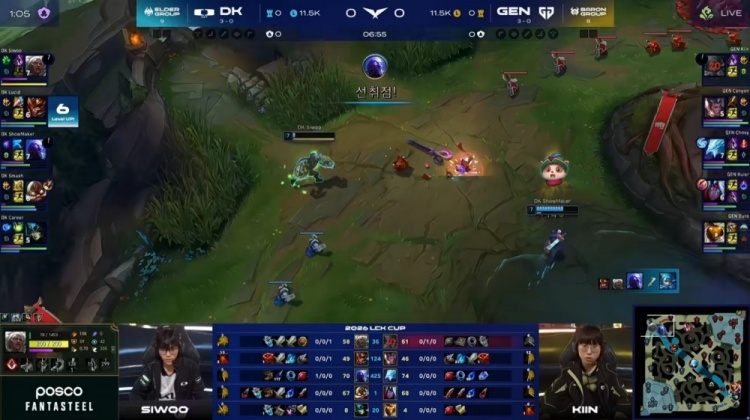 中期上路混战,Lucid皇子上路先被击杀,GEN以1换2占优,随后Siwoo安蓓萨上路留住Chovy冰鸟拿到人头,但Siwoo接着传到下路就被GEN三人越塔击杀。后续Canyon赵信控下小龙,GEN经济领先2.6k,并在中路团战打出1换3拿下大龙,经济领先扩大至5k。