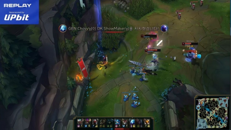 【13:15】上路混战,Lucid皇子没闪进人群先被击杀,许哥瑞兹开车来上配合队友击杀Canyon赵信,但Chovy冰鸟再杀许哥瑞兹,GEN打出1换2。