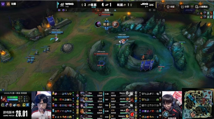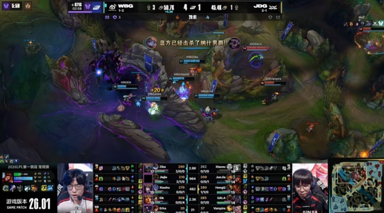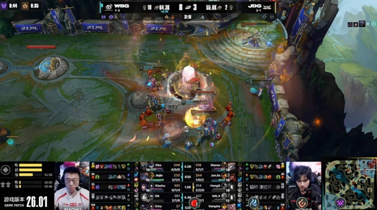 直播吧1月24日讯 2026年LPL第一赛段今天继续,今天的第二场比赛是WBG对阵JDG!