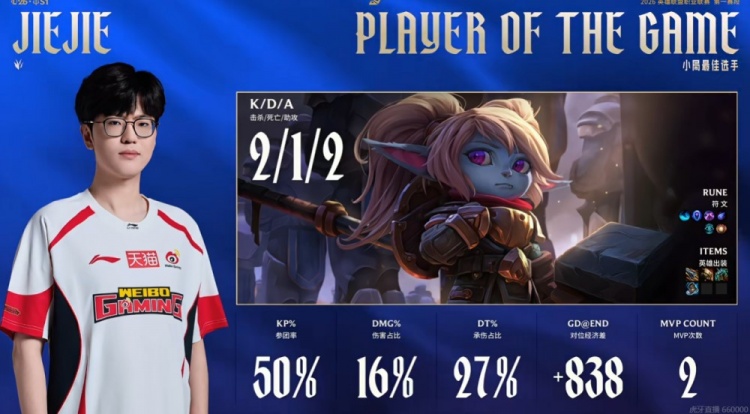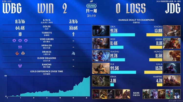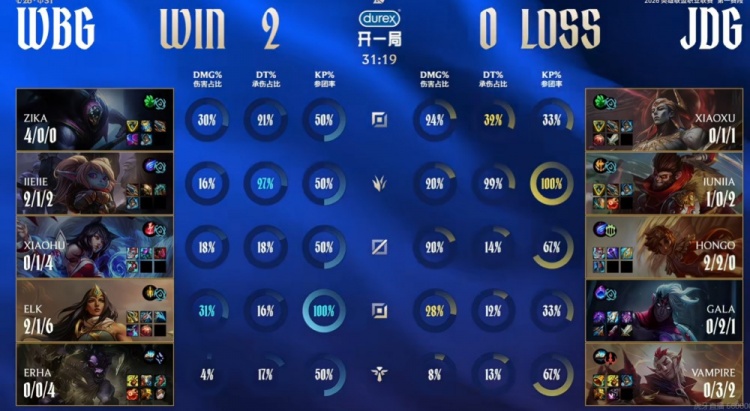 第二局Erha牛头巧妙绕后帮助Jiejie波比拿下一血!WBG全线都是对线优势早早拿下2K的领先!中期Zika贾克斯无限单带给足了JDG压力,WBG毫无压力和JDG往后运营!Zika贾克斯直接找机会单带掉了JDG下路高地!HongQ岩雀下路想针对贾克斯结果被WBG反蹲反击成功,Zika贾克斯越塔双杀,WBG拿下人数优势直接收下大龙拉开经济差!最终中路团JDG终于强杀Elk希维尔成功,但是Zika贾克斯已经切碎了JDG的后排!打出1换3的WBG直接拦人+拆家两不误,直接一波结束比赛,拿下自己的第二胜!