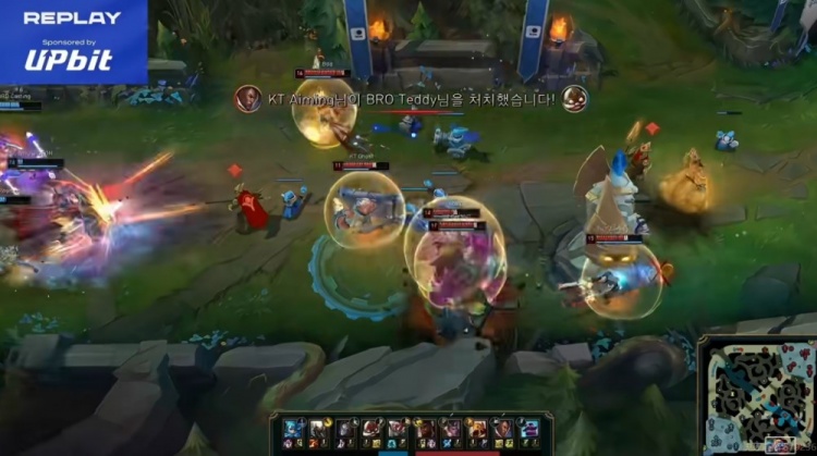 比赛进入中期,22分钟BRO再抢第四条小龙,25分钟KT开大龙,BRO一看打野没闪直接不要了!反手拆掉了KT的中一塔!28分钟BRO再拿一条小龙,拉扯局Roamer发条转三个但是没有后续伤害,Ghost布隆大招留人效果很好!配合上了R闪的赵信!Bdd沙皇打死不推,沙兵猛戳补充输出!这波KT打出1换2!反超经济!