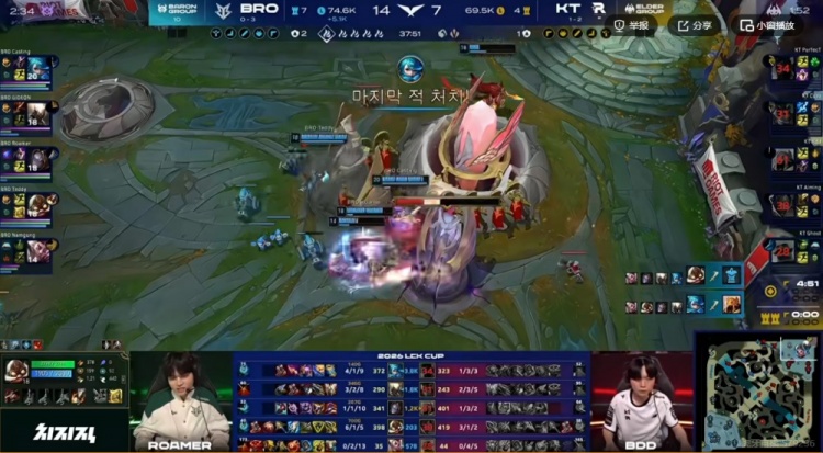 37分钟Bdd沙皇绕后,但是正面开团的Cuzz赵信直接没了!BRO打出4+1高地团灭KT。从上路一波结束首局比赛!