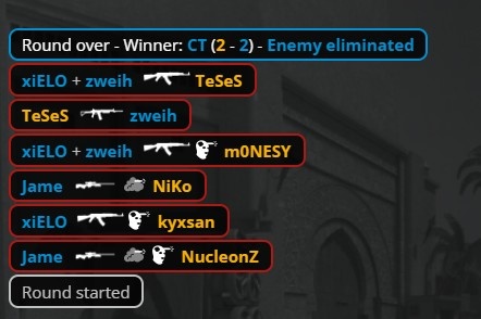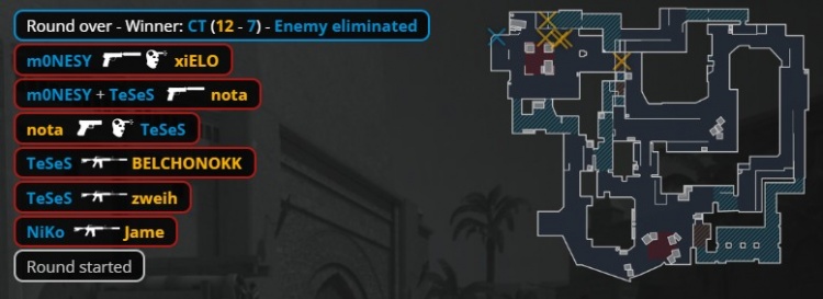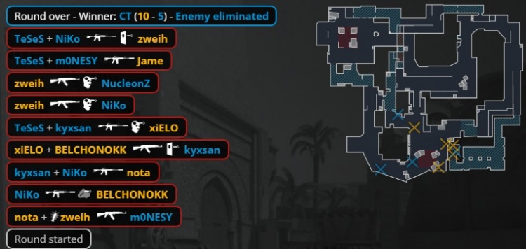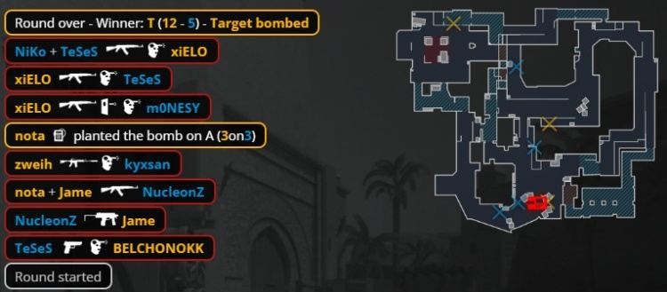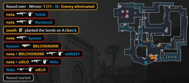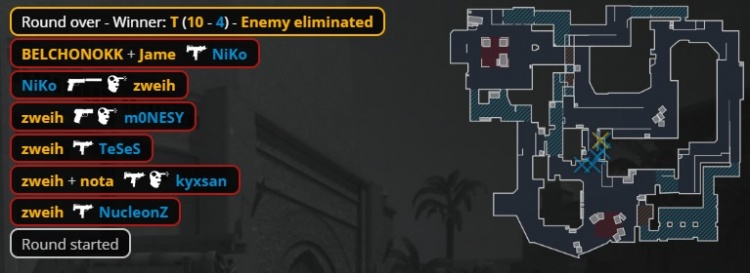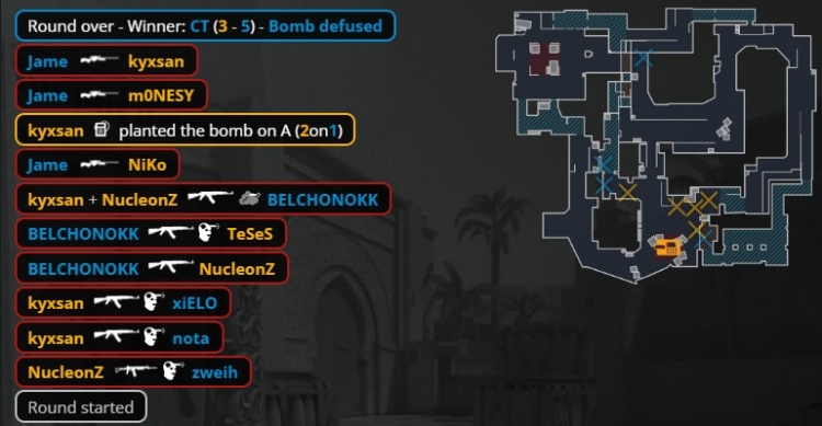 来到长枪回合Jame电话亭大狙轰掉Niko,猎鹰没时间下包,Zweih双杀收尾,PV拿到首分。随后又是上帝电话亭先杀拱门NucleonZ后再杀Niko,PV扳平比分打炸猎鹰经济。次回合zweih手雷一炮双响为PV拿到第3分。
