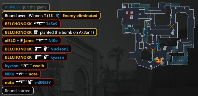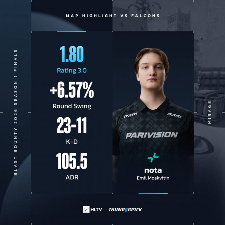 关键第21回合,Niko中路双杀被换,nota再捡到大狙保枪,猎鹰拿到第9分。次回合PV中路夹A,BELCHONOKK进A沙鹰双杀下包,捡到AK斩掉龙哥,单局三杀,PV以13-9拿下图一。