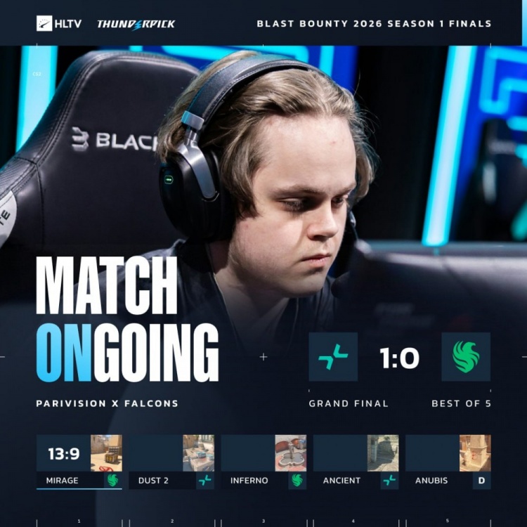 直播吧1月25日讯 2026年CS2首个大赛BLAST赏金赛S3决赛,由Falcons对阵PARIVISION!