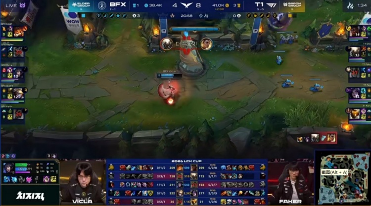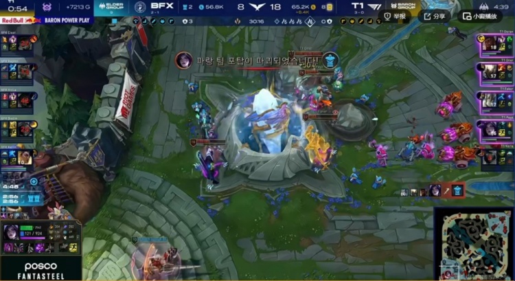 比赛进入中期,20分钟BFX三人下路强杀Faker加里奥,但是Oner潘森跳大+Keria巴德 支援赶到,BFX野辅被换掉!T1拿下2K经济优势!随后再拿听牌龙!24分钟Kellin芮尔巧妙绕后配合队友秒了Peyz卡莎,随后Faker加里奥落大强行和Raptor琪亚娜互换,BFX的1换2!拆掉T1中一塔!