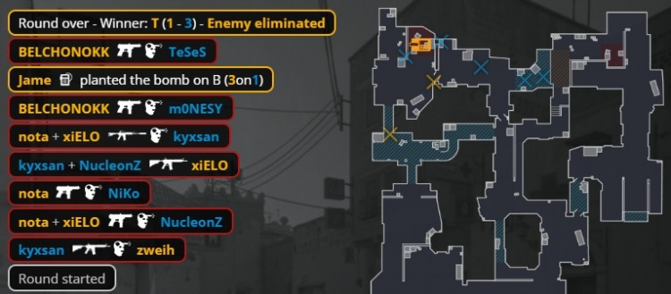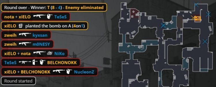 半场结束前最后一回合,孩神大狙被换到B区,上帝带队五人假打B真打A小,Niko与核爆哥看A小被杀,zweih中门双杀从B回防的K3与孩神,PV以8-4结束上半场。