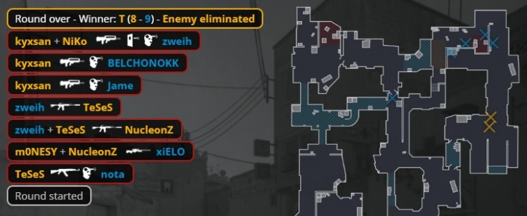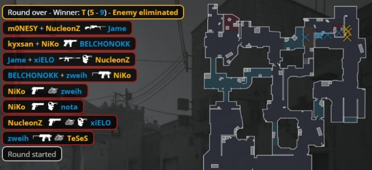 次回合猎鹰冲B打掉KK后也下包拿分将比分扳至9-9平。第19回合nota看A小打掉核爆哥, 上帝大狙先杀A小K3再转A大坑方向打掉Niko,PV完美团灭猎鹰拿到第10分。