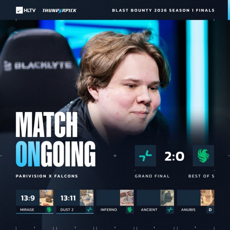 直播吧1月25日讯 2026年CS2首个大赛BLAST赏金赛S3决赛,由Falcons对阵PARIVISION!