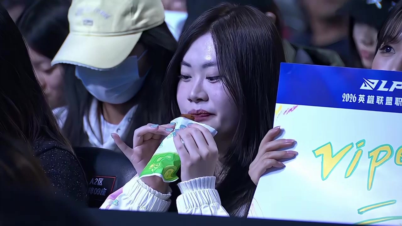 导播没镜头给么?JDG北京场馆现场镜头给到正在吃烤肠的女观众