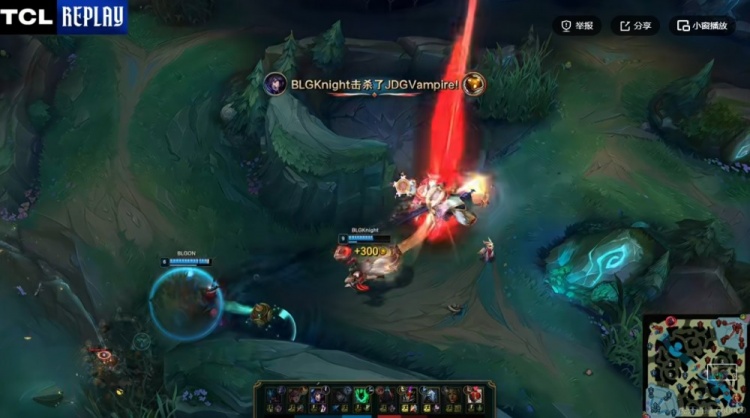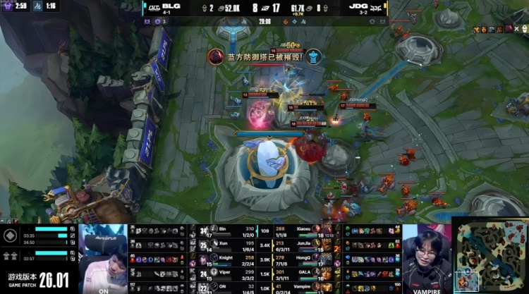 【14:25】JDG拿下第二小龙,但是HongQ维克托省闪吃到了ON锤石钩子!knight阿狸开大追击配合队友先秒维克托!回头多个人的BLG越塔,虽然野辅抗塔被换,但是Viper厄斐琉斯拿下双杀!这波BLG打出2换4!