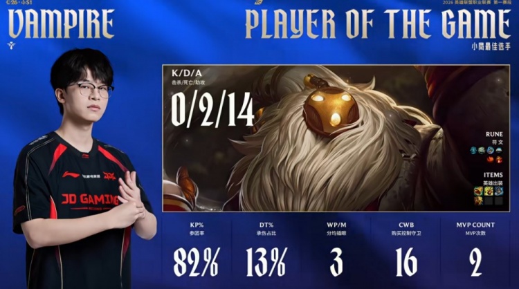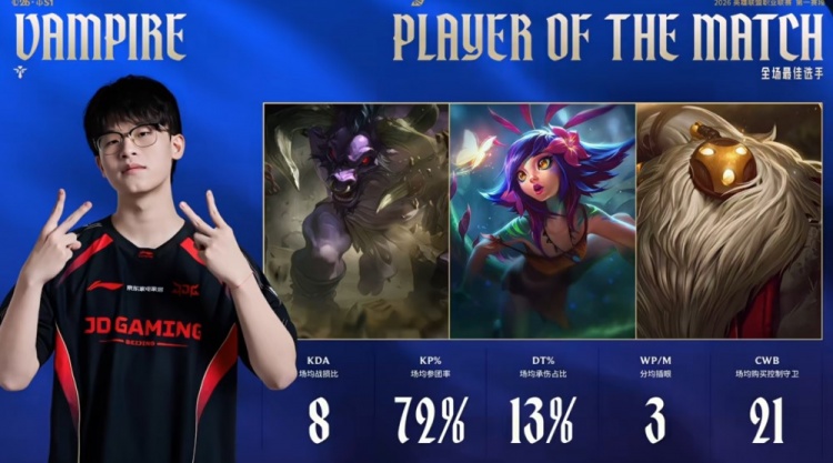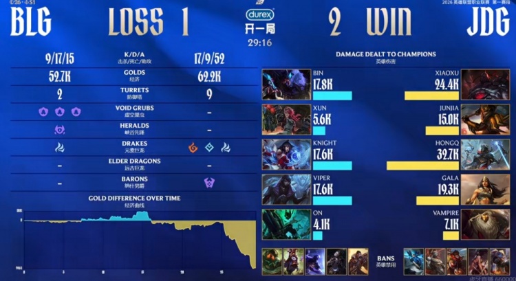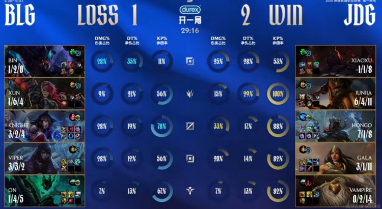 决胜的龙魂团BLG不得不看,但是连续几次团战Vampire巴德全是完美大招,连续保住了GALA希维尔让他没被秒掉!反而是交闪进场的Viper厄斐琉斯被Junjia皇子强开击杀!这波JDG击杀BLG四人拿下大龙拉开经济差!随后下路团Xun蔚绕后想强开,但是Vampire巴德再次立功,大招金到BLG上野分割了战局!这波JDG击杀BLG四人,一波结束比赛,双循环小组赛完成对BLG的二连击败!