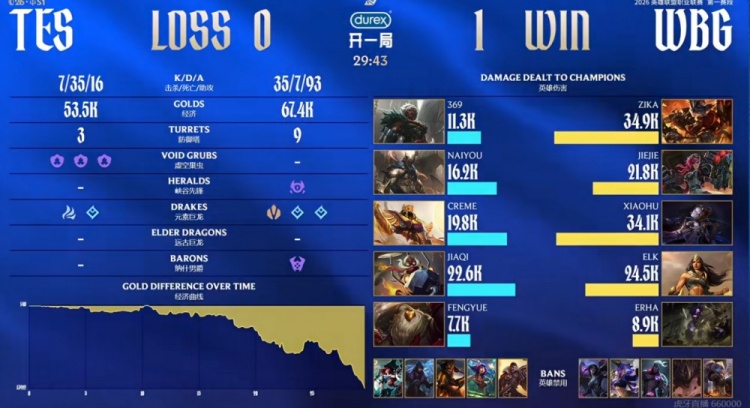 首局比赛WBG下路对线优势,369安蓓萨5级断线送出一血之后连续被gank针对!中期团战Elk希维尔连续收头,WBG不断拉开经济差!
