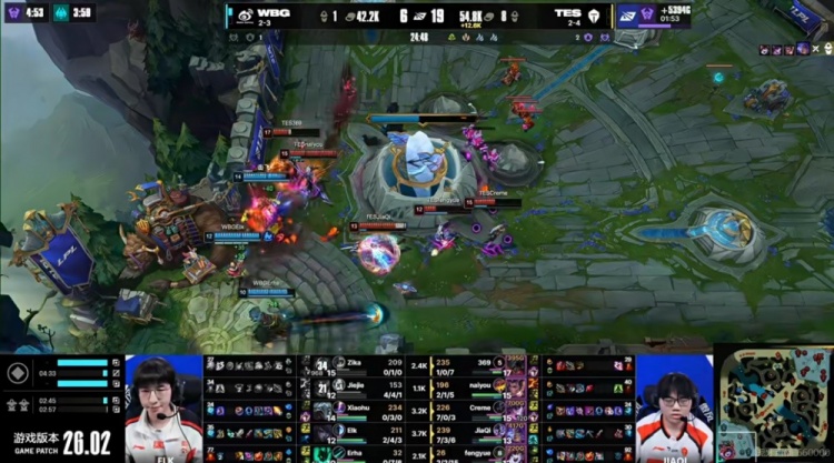 中期WBG办法不多,Erha锤石几次开团队友没法跟自己反而白给!TES找到机会秒掉Jiejie皇子之后拿下大龙!369剑魔向前交闪留到了Xiaohu维克托,Fengyue璐璐闪现变羊还命中了Elk厄斐琉斯!TES击杀WBG双C,从中路一波结束第二局比赛!扳平了比分!