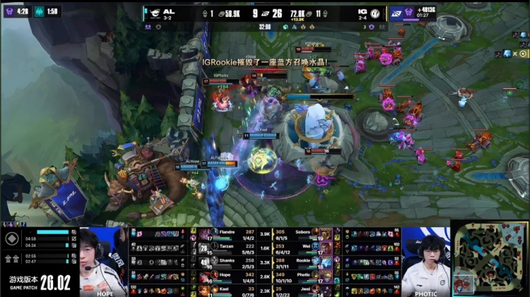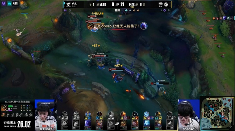 【18:47】iG野辅上路逮捕Flandre阿萝拉,随后AL中路推掉iG一塔,AL经济落后4k。