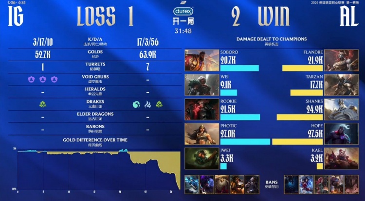 直播吧1月27日讯 2026LPL第一赛段组内赛继续进行,今日第三场比赛AL战胜iG!