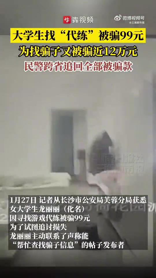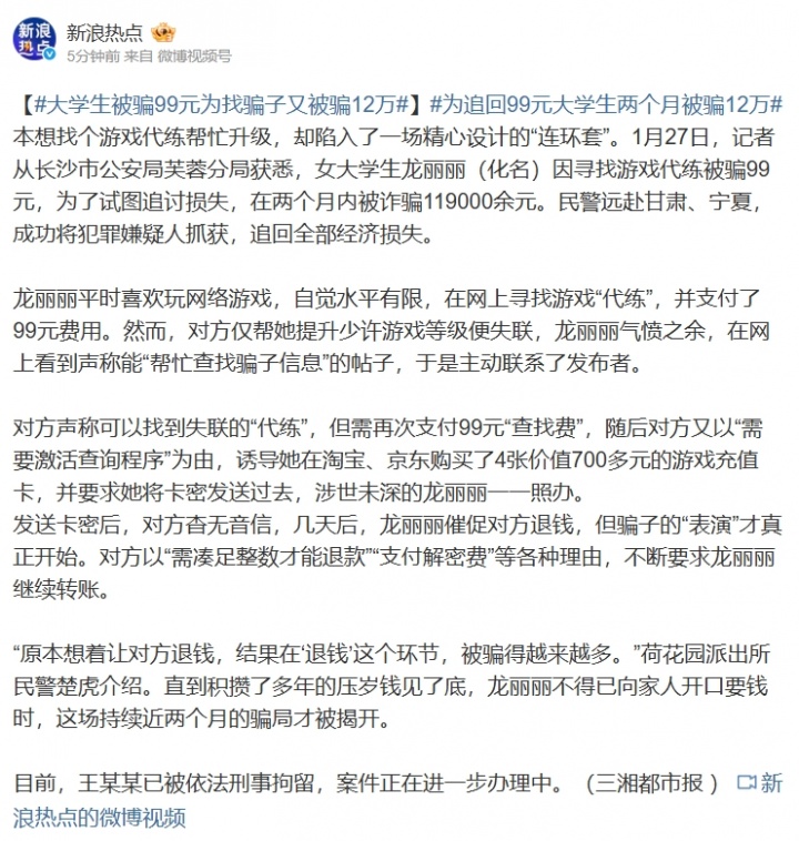 根据三湘都市报报道,女大学生龙丽丽因找游戏代练先被骗 99 元,为追回损失联系网上声称能查骗子信息的人员,又接连被对方以查寻费、激活程序、凑整退款、解密费等理由诱导转账,两个月内累计被骗 119000 余元。民警远赴甘、宁抓获嫌疑人王某某,现已依法对其刑事拘留,案件正进一步办理,且全部损失已被追回。