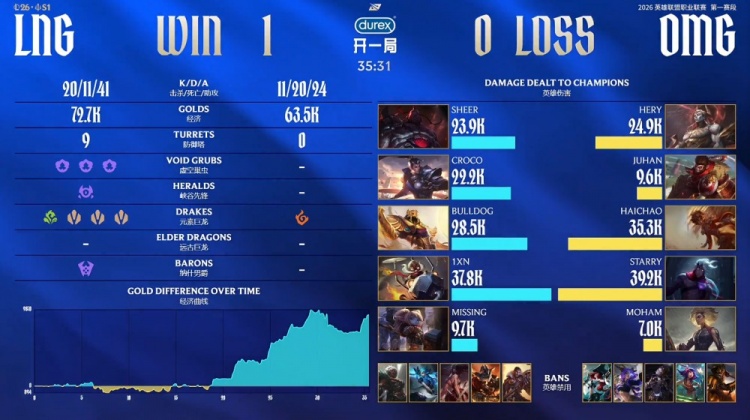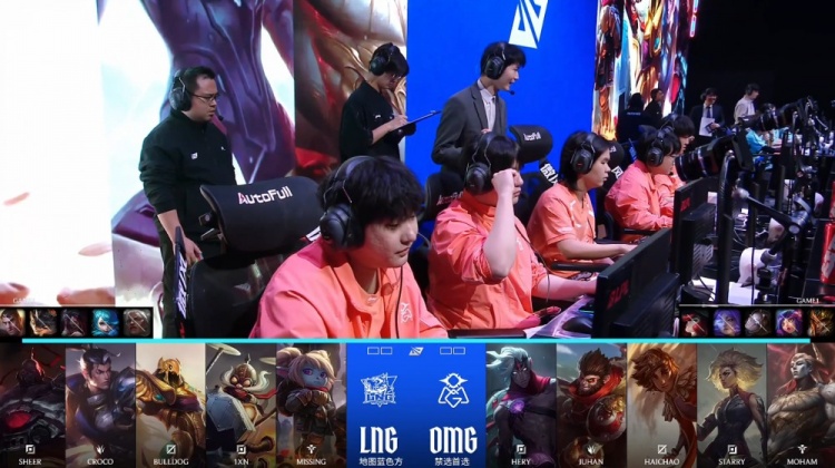 后期Junhan猴子被逮捕,LNG回头开大龙,OMG四人接团将Moham人头与大龙拱手相让,LNG经济优势来到6k。随后LNG中下推进吸引OMG打团反遭OMG打出1换2。后续双方持续拉扯,河道LNG双人组被杀,但经济优势依然存在8k。