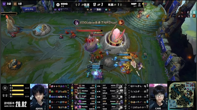 第二局前期Xiaohao猴子gank中路先拿Care阿卡丽一血,Guwon潘森飞下换掉Parukia妮蔻,Care无纪律中路遭Angel发条单杀。下路Leave卡莎想单杀Assum失策被反杀,小龙团Parukia妮蔻大三人配合Zdz奥恩叫羊,EDG打出2换3经济领先2k。