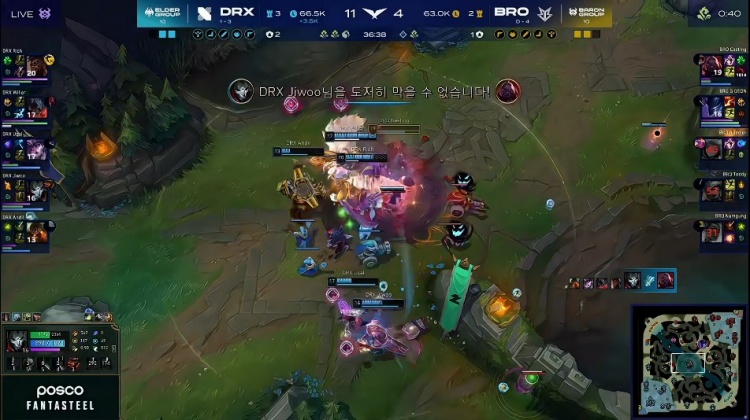 36分钟双方在中路爆发团战,佐伊被先手开到击杀,随后小炮也被DRX留住收下,DRX抓住机会收下BRO三人后直接顺势想要一波拿下,单杀梦魇开大收下辛德拉成功守住水晶!