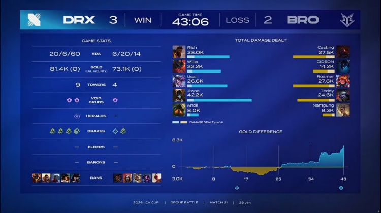 直播吧1月28日讯 2026LCK继续进行,本场比赛是由BRO对阵到DRX!