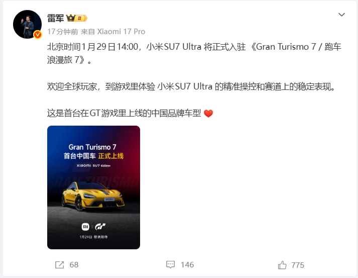 直播吧01月28日讯 小米老板雷军今日宣布,北京时间 1 月 29 日 14:00,小米 SU7 Ultra 正式上线 Gran Turismo 7 / 跑车浪漫旅 7(即《GT 赛车 7》),是首台上线的中国品牌车型。