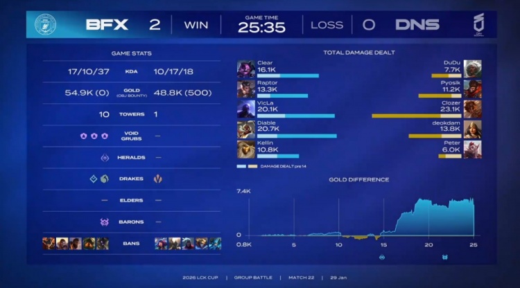 直播吧1月29日讯 2026 LCK CUP来到超级周,今日由DNS对阵BFX!