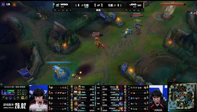 【11:08】Jiejie想要上河道蟹又被JDG众人逮捕,战绩来到2-3-0。双方经济持平。