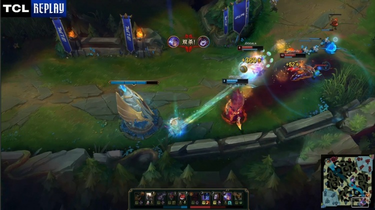 【19:41】上路团战,xiaohu辛德拉交出金身拖到队友到位让Jiejie潘森反杀HongQ发条,后者战绩0-3-6。