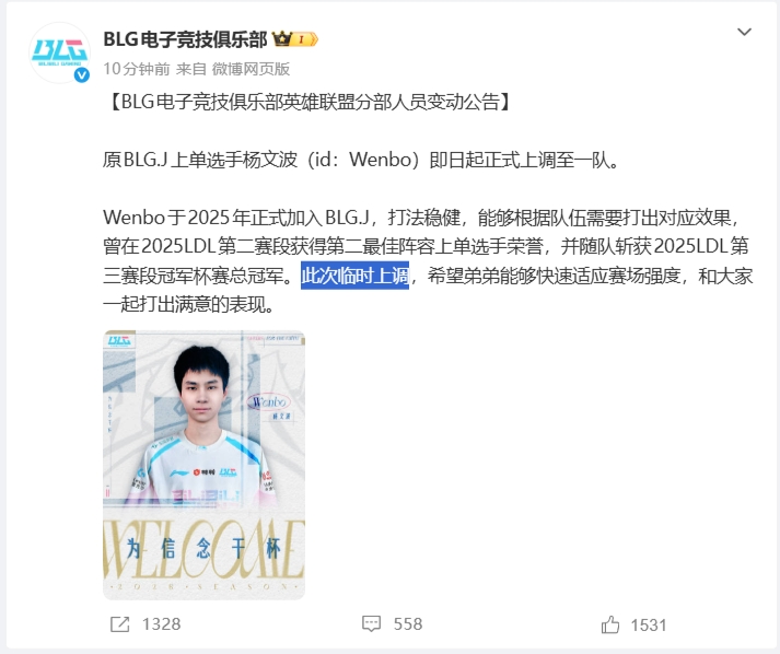 在官宣文案中BLG写道:“此次临时上调,希望弟弟能够快速适应赛场强度,和大家一起打出满意的表现。”