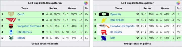 目前LCK CUP的积分榜如下: