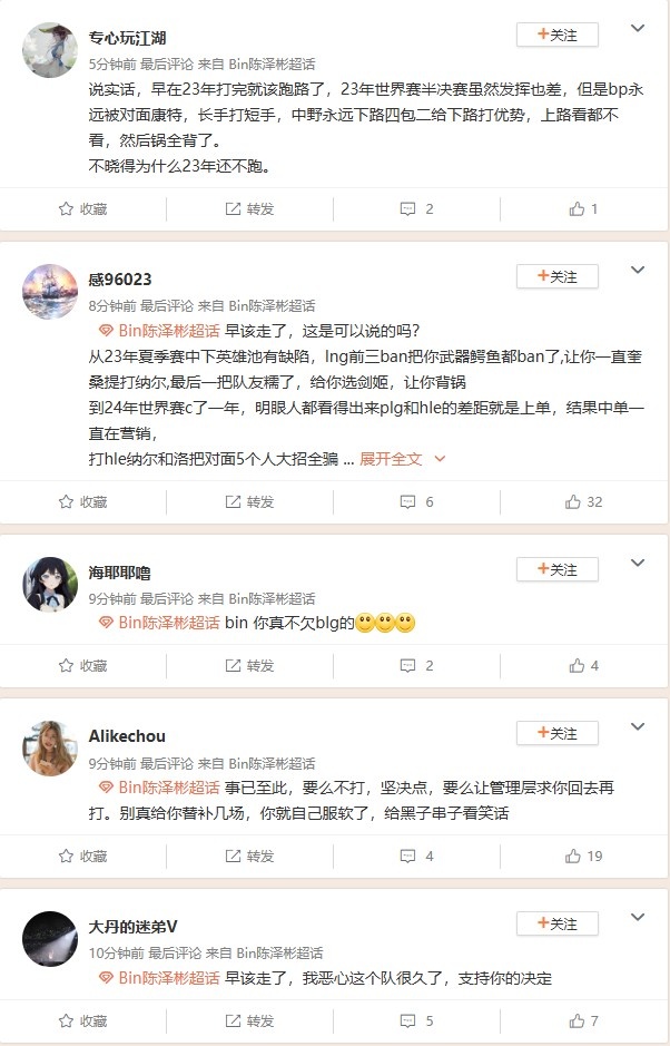 ~~怎么上单一出事就默认都是他的问题?blg队粉都看bin不爽是吧?德杯赢的三场哪场不是bin一个人爆c赢下来的?四连胜也是次于左手的第二功臣吧。怎么有些人默认一出事就是bin的问题?呼吸前几天就说blg之前找他去去替补了。bin年年不拉扯,连续降薪留队,对不起谁啊?这样对待建队基石,bin为了首发跑了也是无可厚非!更别说sak刚才爆料了,bin还在基地,是和glc吵架了。还有说bin是给丹尼说话才和glc吵架的