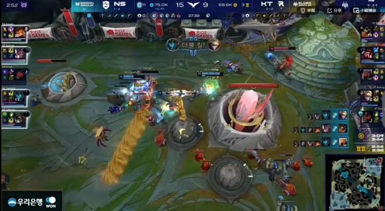 【35:48】NS先拆中路高地,KT强开但是秒不掉Taeyoon卡莉斯塔啊!NS转下再破一路!回头开打远古龙!KT没视野根本来不了!NS收下远古龙!高地团Scout发条一打四毫无压力,Bdd沙皇推回两个但是被Lehends烈娜塔一个大招全克完了!NS击杀KT四人结束比赛!拿下三个赛点!