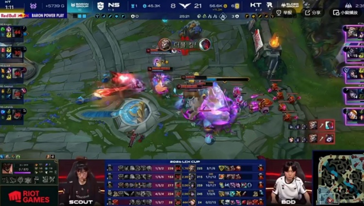 【18:30】中路团战Aiming厄斐琉斯成功拉扯,这波双方AD都交闪没死,KT拖到了Bdd阿狸转好进场收割!双方打出2换2,KT还拆掉了NS的中路高地!