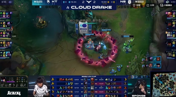 【14:10】下路遭遇Sponge皇子不开大直接白给,Scout加里奥交大招但是和绕后的Kingen酒桶毫无配合!NS的集火目标完全不一致!这波Cuzz贾克斯双杀,KT再打一波0换3!随后中路团Cuzz贾克斯又换掉了NS的下路双人组!