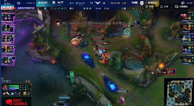 【31:40】KT拿下大龙,但是PerfecT雷克塞进场白给了!NS追击强杀掉了KT中上,拆掉中二塔+中路高地!打回近3K经济差!KT抱团反打,皇子换掉Aiming女枪,但是KT中上不断追击,留住了NS下路双人组!