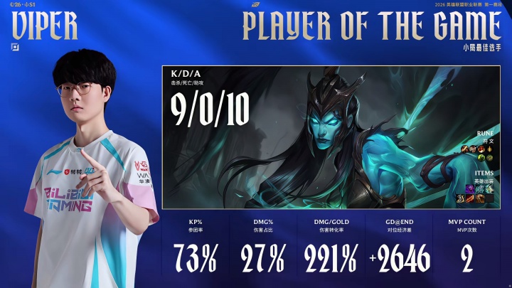 >V神杀疯了!Viper滑板鞋狂砍9/0/10数据拿下对阵TES首局MVP