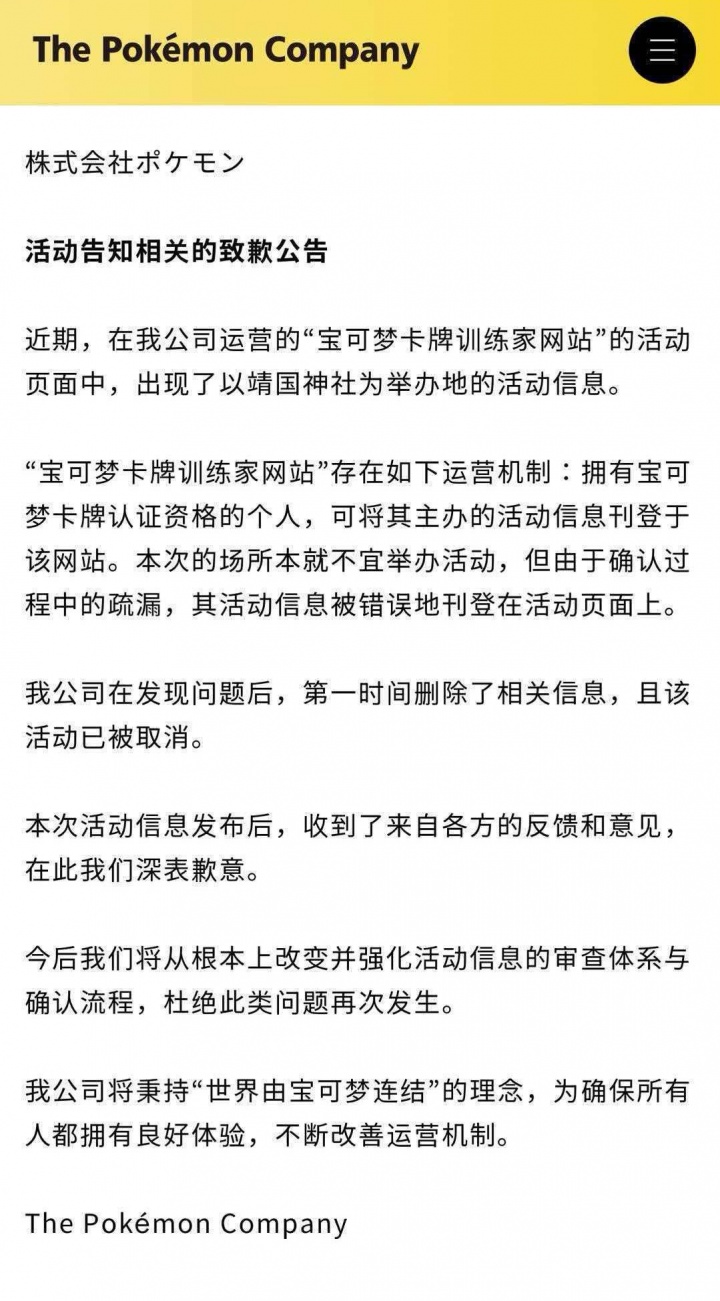 直播吧1月30日讯 1月30日,宝可梦公司在官网发布道歉公告:在我们公司运营的“宝可梦卡牌游戏训练家网站”的活动搜索页面上,发布了有关将在靖国神社举行的活动的信息。